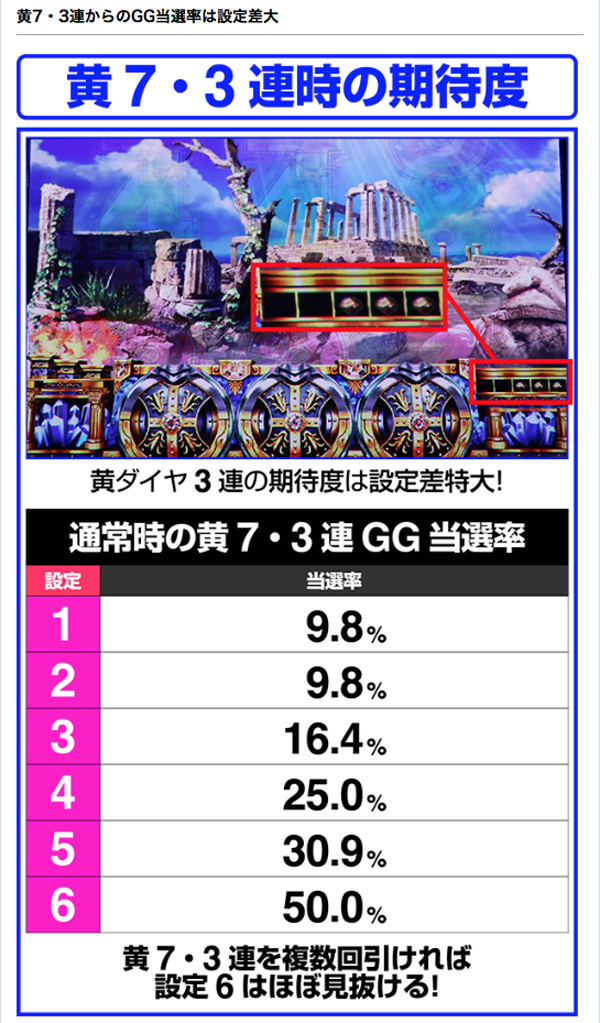 GG終了後に移行するオリオンステージでは、1G目のレバーオン時に一瞬だけみえる数字に注目。高設定に期待できるパターンが存在する。