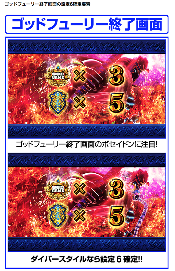 ゴッドフューリー終了画面も要チェック。ダイバースタイルのポセイドンが出現すれば設定6が濃厚だ。