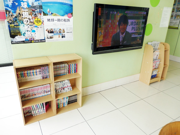 レストコーナーは、すっきりと整頓されており、遊技の合間に大型TVや漫画などでリラックスできる空間となっている。店内には、様々なアメニティーグッズ・無料ロッカー・ひざ掛け貸出などのサービス面も充実。