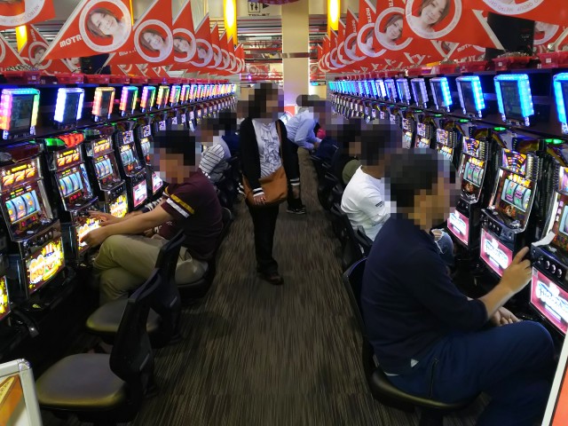 取材日もたくさんのプレイヤーが来店。パチンコ・パチスロの各シマに笑顔が広がっていた。