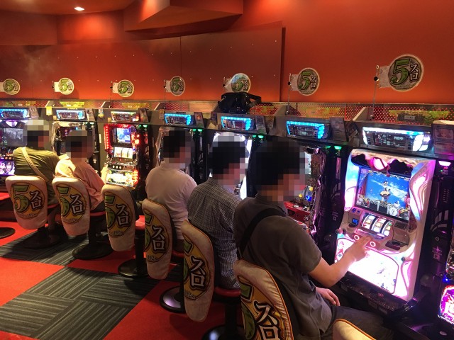 「CRAスーパー海物語IN沖縄4withアイマリン」のシマもにぎわいが大きい。全5台とはいえほぼフル稼働といった状態で、皆一様に楽しんでいた。