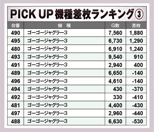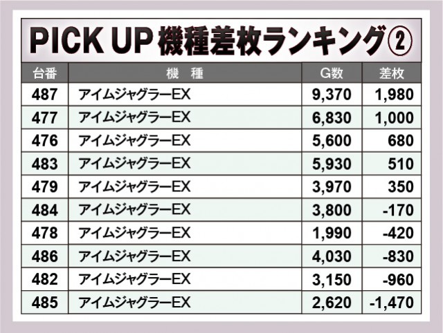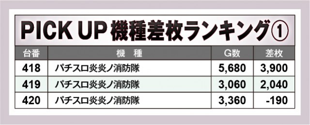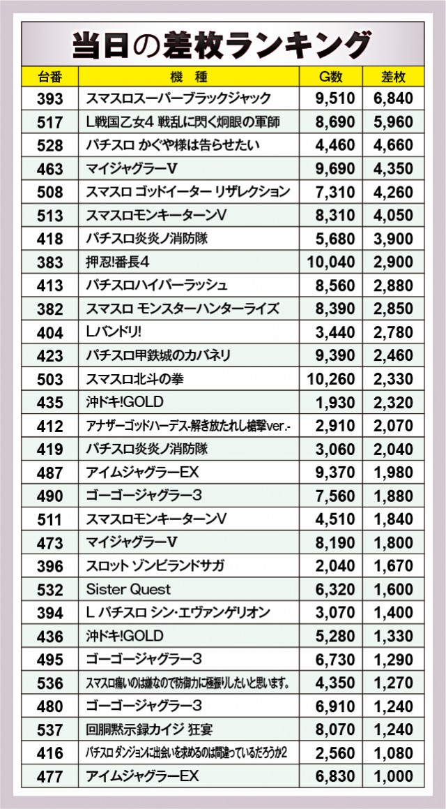 『アイムジャグラーEX』『ゴーゴージャグラー3』の両機種は回転数と差枚数が比例する展開を披露しており、優秀機種として存在感を放っていたと言える。9,000回転など終日を通して打ち込まれた形跡は、大きな手応えを感じていたことの証明だろう。『パチスロ炎炎ノ消防隊』も気を吐いており、2~3,000枚OVERとまとまりのある出玉を放っていたのが鮮烈だ。