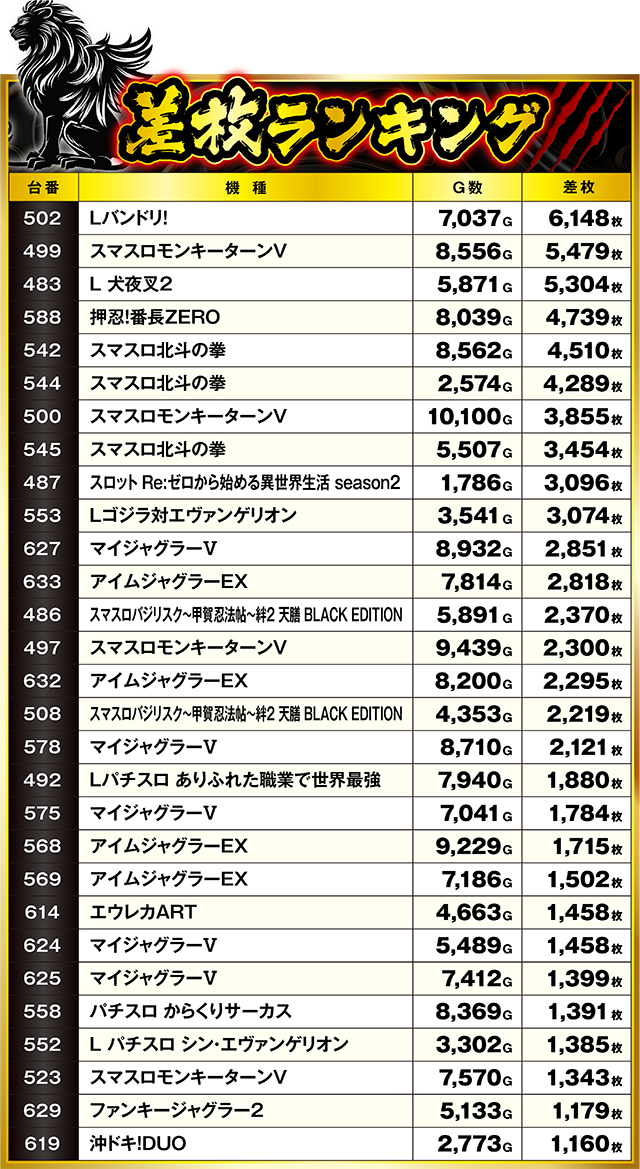 名だたる強力マシンを押し除け、まさか『Lバンドリ!』が差枚ランキングの頂点に立つなど、誰が予測しただろうか。しっかり良挙動ぶりを見せつけ、堂々の1位記録となったのは、少台数機種にもチャンスが潜んでいた証だ。