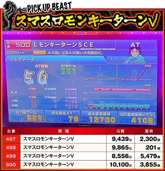 『スマスロモンキーターンV』は全台プラスを達成!498番台のみやや危なげなプラス差枚だったものの、残る3台は順当にATを引き当て、挙動の良さを存分に見せつけてくれた。