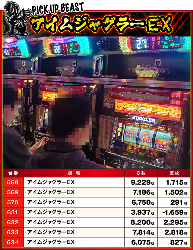 残念ながら1台だけがマイナスに…。7台中4台が1,500枚を上回るなど、偶然では絶対に生まれない結果なのは一目瞭然。やはり『アイムジャグラーEX』にはチャンスが多かった…!?