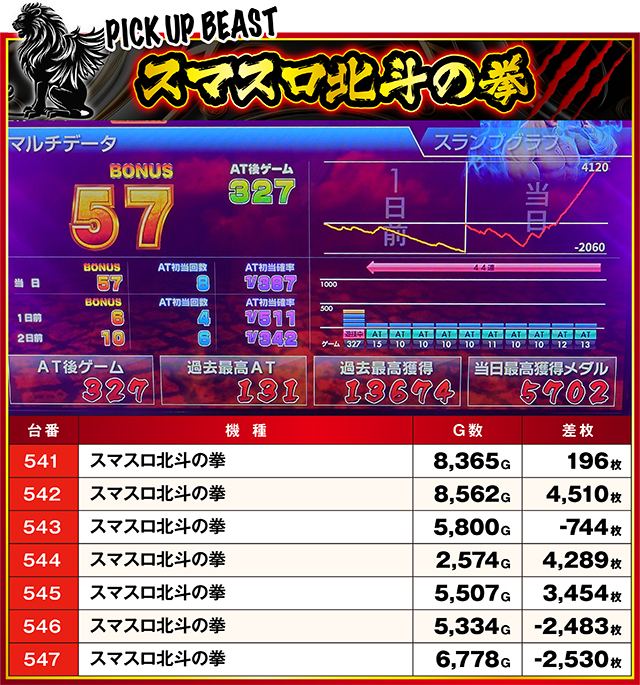 約半数の台が3,000枚オーバーを果たすなど、注目を集めていた『スマスロ北斗の拳』。前回2月11日の結果では、2,000枚超え記録が生まれてなかったことを踏まえると、かなりのパワーアップをしたと考えられる。