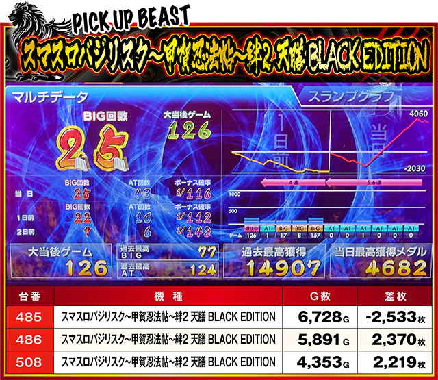 すでにオールドマシンと化している『スマスロバジリスク~甲賀忍法帖~絆2 天膳 BLACK EDITION』だが、ココではまだ現役も現役。腰を据えてブン回せば、ヘタな新台よりもいい結果になるかも…!