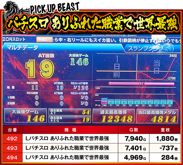 導入から約1ヶ月が経過した『Lパチスロ ありふれた職業で世界最強』は今回やや失速気味。3台中2台が差枚ランキングに入賞した前回と比べると、どうしても控えめな印象が拭えない。