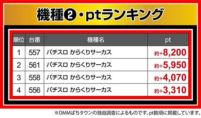 『パチスロ からくりサーカス』も活気は大きく、4台が約+3,300pt以上を記録。
