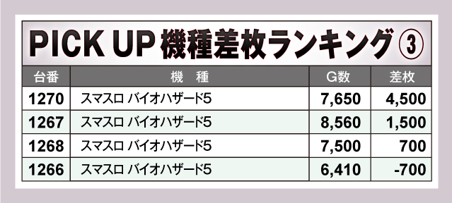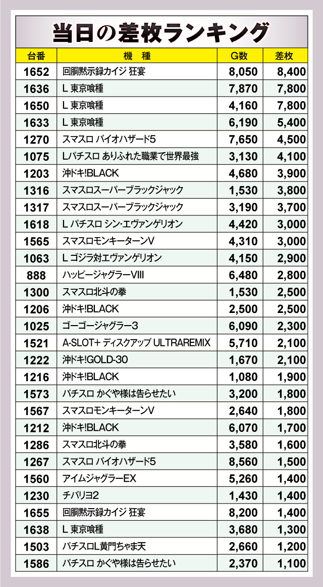 まずは差枚ランキングのチェックから。30台のうち18台が+1,000枚オーバーで、+3,000枚オーバーは11台出現。それらのなかでもっとも優秀だったのは、1652番台の「回胴黙示録カイジ 狂宴」で、差枚は+8,400枚を獲得! またランクイン機種を見渡してみると、スマスロが大半を占めるなかジャグラーシリーズが多数ランクイン! ハイスペック機種からノーマルタイプまで幅広い機種にチャンスが隠されていたようだ!