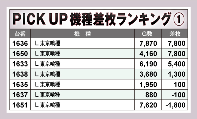 続いては、当日とくに盛り上がっていた3機種を紹介。まず「L 東京喰種」は、ピックアップ7台並びのうち3台が+5,000枚オーバーのプラスと素晴らしい結果をマーク! また「回胴黙示録カイジ 狂宴」も素晴らしく、2台/3台が4ケタプラスとこちらも申し分のない記録を残していた!