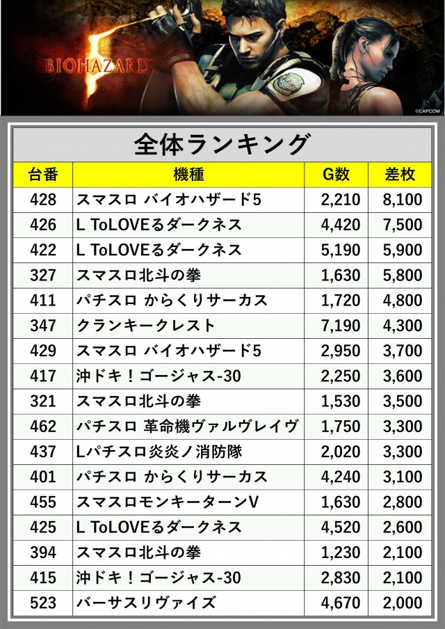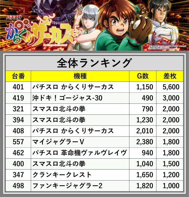 厳選された取材対象機種をはじめ、その他スロット全体から好記録が飛び出した!プレイヤーが楽しんだ1日を下記データにて振り返ってみて欲しい。