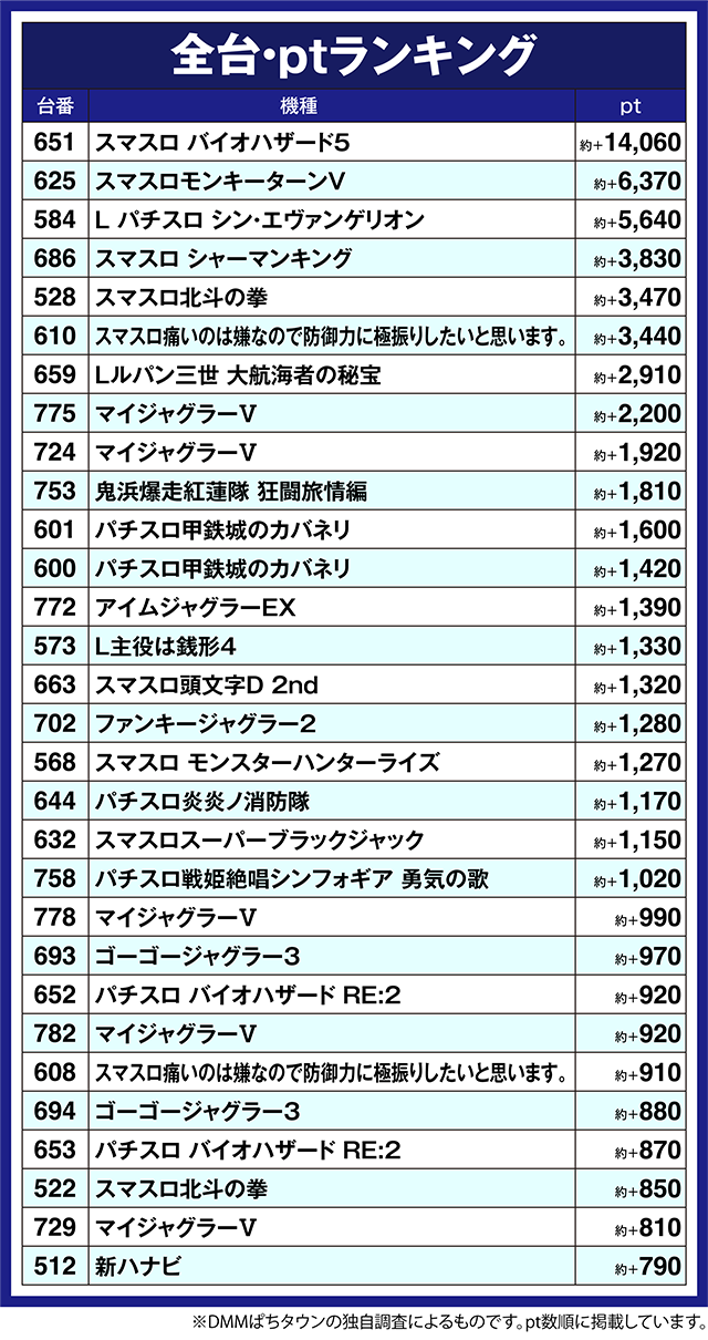 最新機種の「スマスロ バイオハザード5」では、651番台が約+14,060pt!
