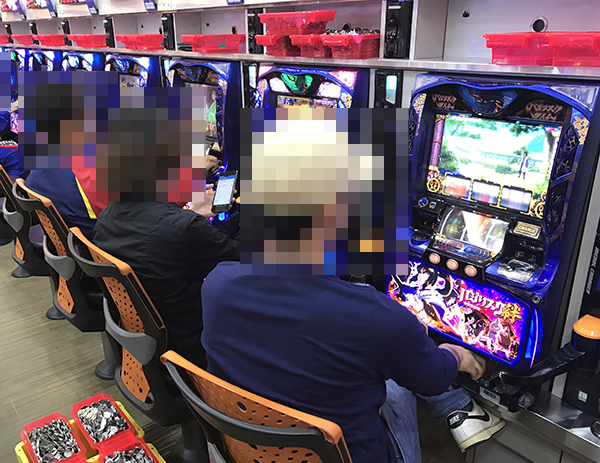夕方頃のパチスロでは、「バジリスク~甲賀忍法帖~絆」や「押忍!番長3」に理想的ともいえる展開で遊技を楽しんでいるプレイヤーを発見。輝くような笑顔からは、満足感を得られていることも伝わってきた。