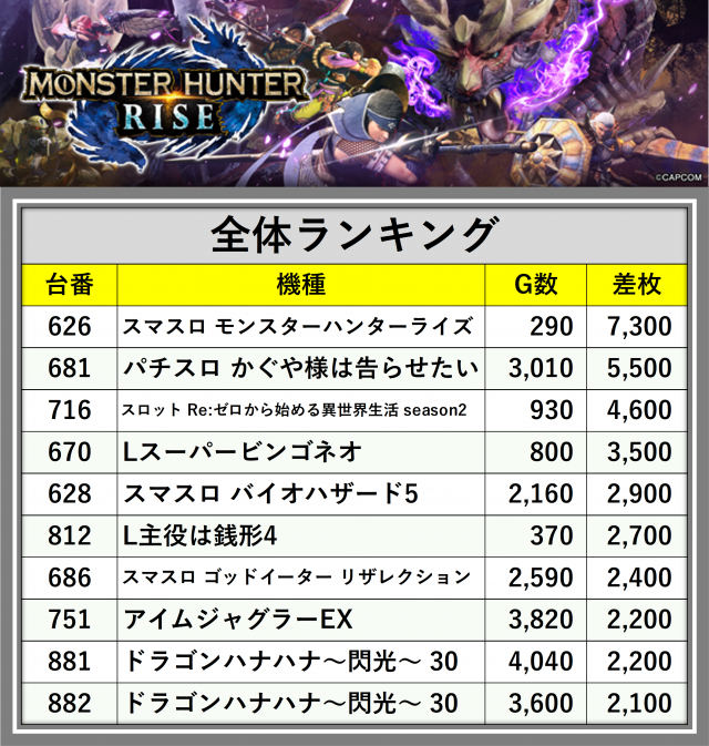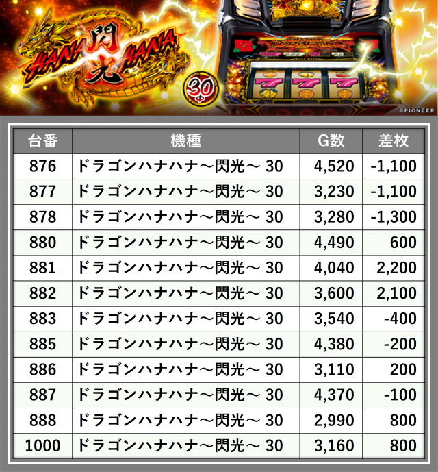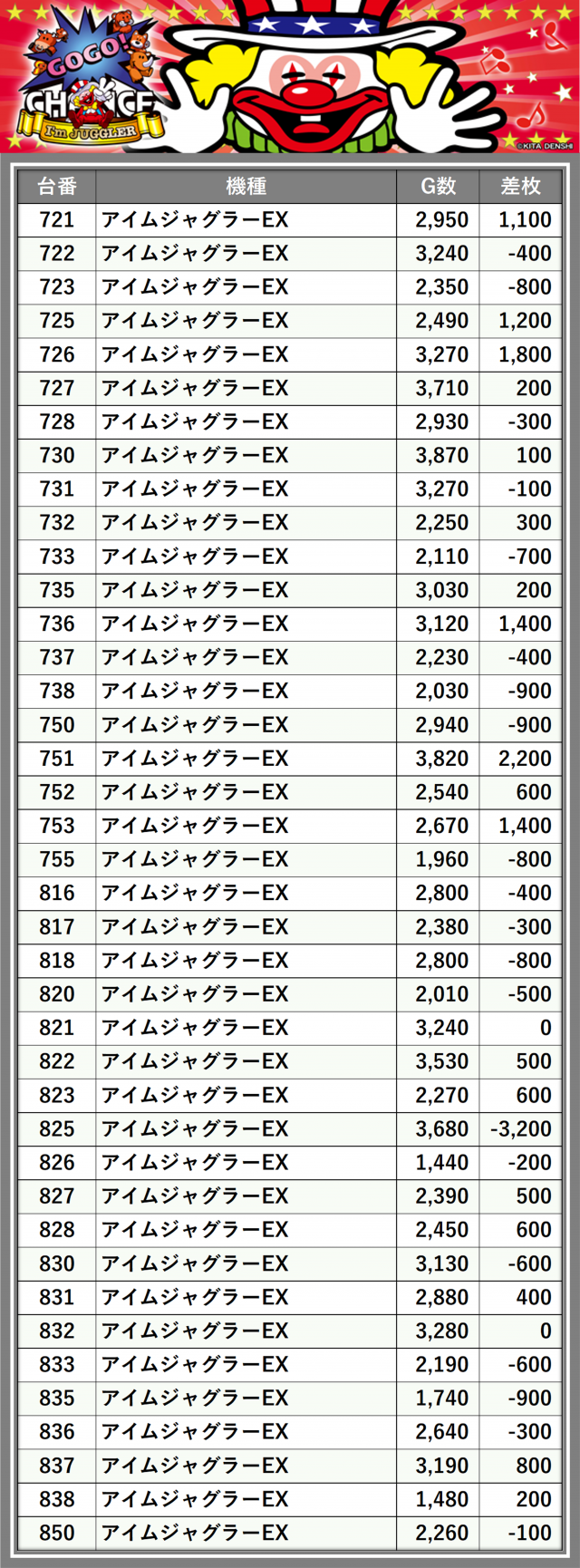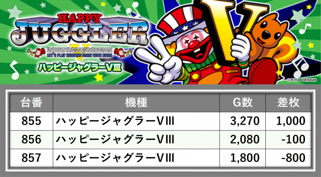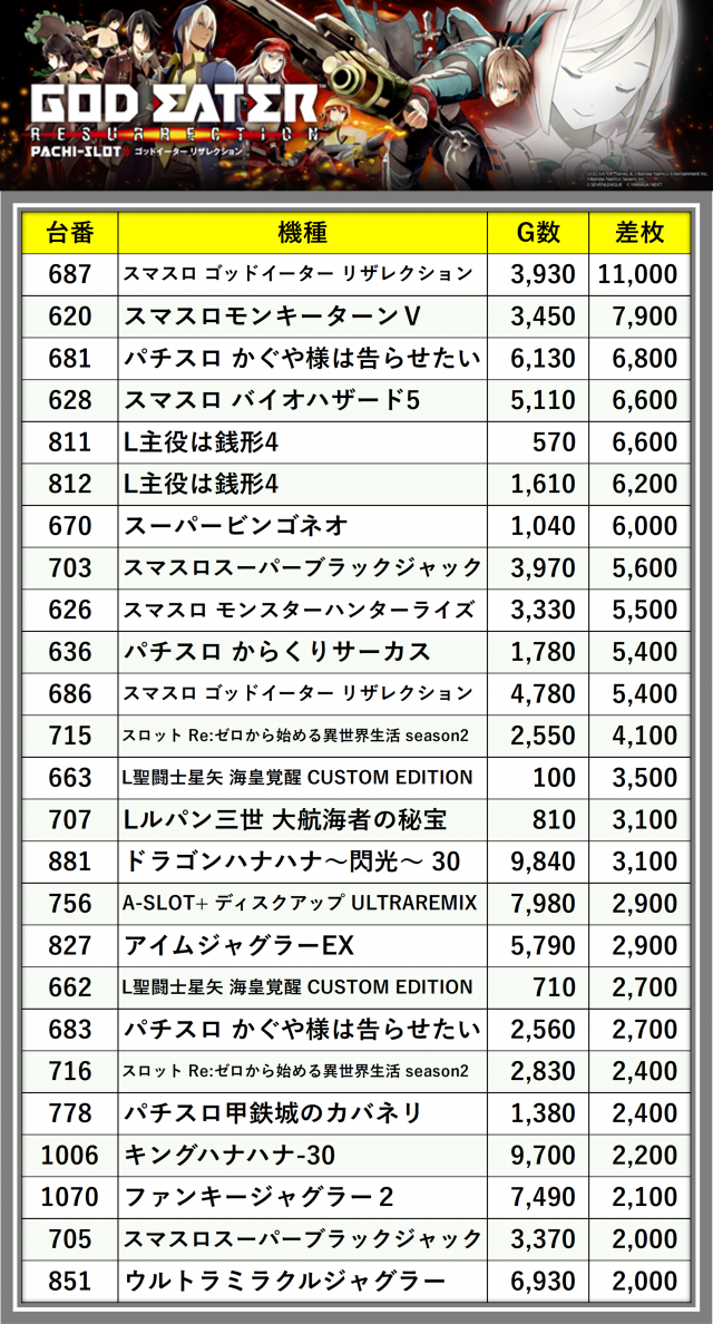 厳選された取材対象機種をはじめ、その他スロット全体から好記録が飛び出した!プレイヤーが楽しんだ1日を下記データにて振り返ってみて欲しい。