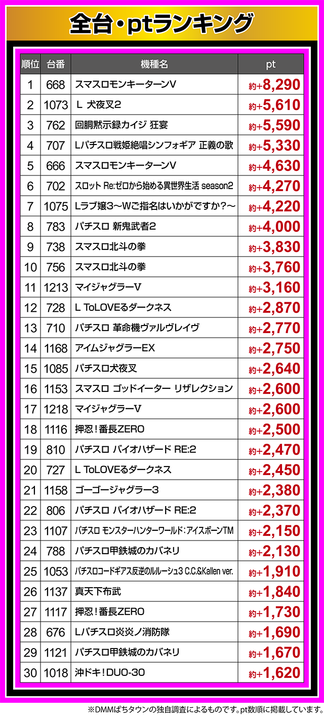 『スロット Re:ゼロから始める異世界生活 season2』の702番台や『Lラブ嬢3〜Wご指名はいかがですか?〜』の1075番台なども約+4,000pt以上を記録。
