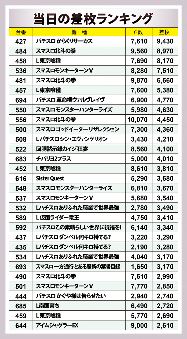 枚数の多い順から並べていくと、『パチスロ からくりサーカス』の+9,400枚超をトップに、『スマスロ北斗の拳』では+9,000枚弱・+6,700枚弱・+4,500枚弱が1台ずつ、『L 東京喰種』では+8,200枚弱・+5,400枚弱が1台ずつ、『スマスロモンキーターンⅤ』の+7,500枚超、『回胴黙示録カイジ 狂宴』に+4,100枚超と、ベテランマシンから新台まで、複数の機種が実力を発揮した。
