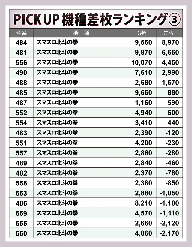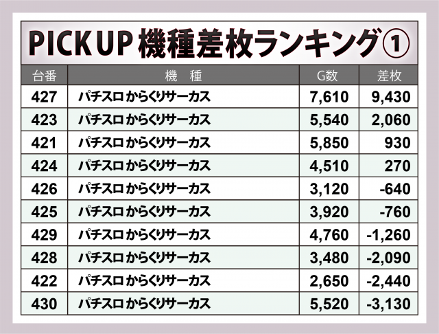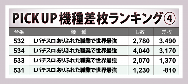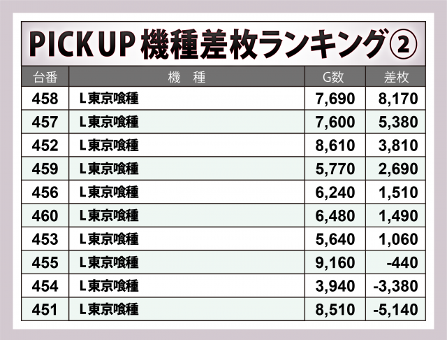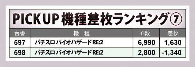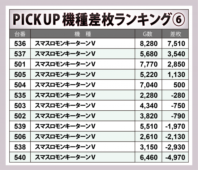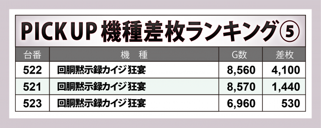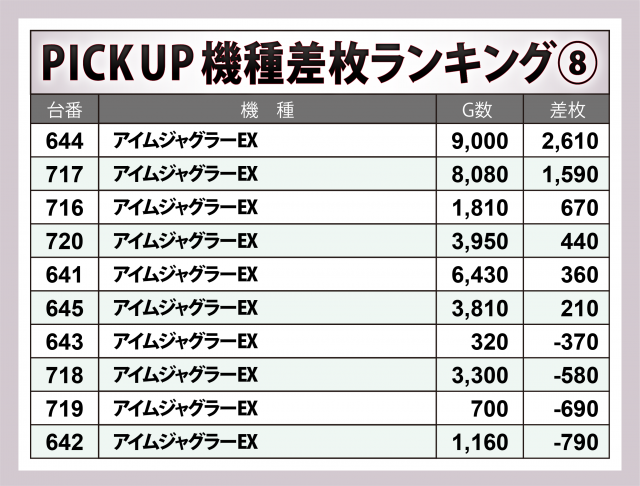 まずは優秀30台の数値をチェック。30台の全てが+2,600枚以上を計上し、+3,000枚以上は全体の8割となる24台、+4,000枚以上は13台、+5,000枚オーバーは6台、+6,000枚オーバーは5台、+7,000枚オーバーは4台、+8,000枚オーバーは3台、+9,000枚オーバーは1台と、惜しかったものの5桁プラス台はカウントできなかった。