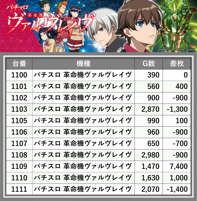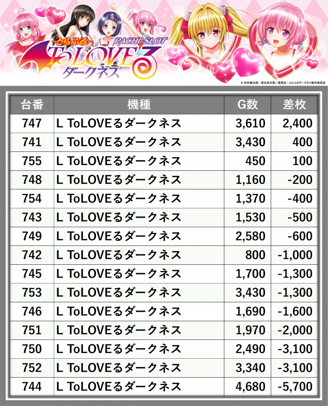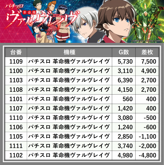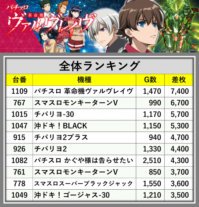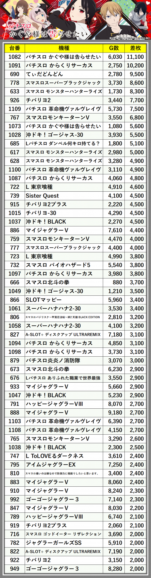 ※差枚数順に掲載しています