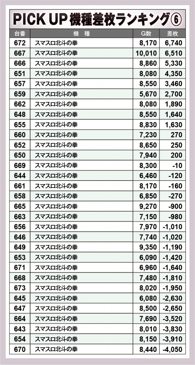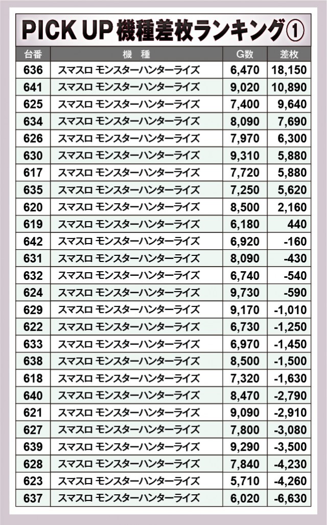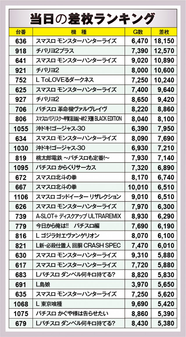『スマスロ モンスターハンターライズ』『チバリヨ2プラス』『チバリヨ2』『L ToLOVEるダークネス』にて万枚OVERが飛び出し、その後続には8~9,000枚OVERを達成する台も見られる。さらに言えば、上表は5,000枚OVERから名を連ねており、店内は凄まじい熱気に包まれていたのが一目瞭然だ。『スマスロ北斗の拳』では万回転OVERを確認でき、いずれの台も終日を通して打ち込まれ、活気と熱気に満ちた1日となった。