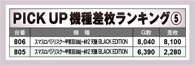 万枚を達成した『スマスロ モンスターハンターライズ』『チバリヨ2』『L ToLOVEるダークネス』の活躍はもはや説明不要だろう。まとまった出玉を確保しており、大きな存在感を放っていた。そして『スマスロバジリスク~甲賀忍法帖~絆2 天膳 BLACK EDITION』は全台プラス差枚数を達成しており、こちらも目立っていた機種の1つである。優秀機種がポテンシャルを秘めていたのは明らかで、遊技していたファンは笑顔を覗かせていたのが印象的だ。