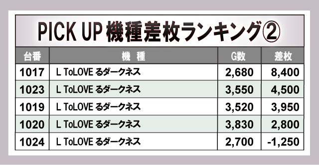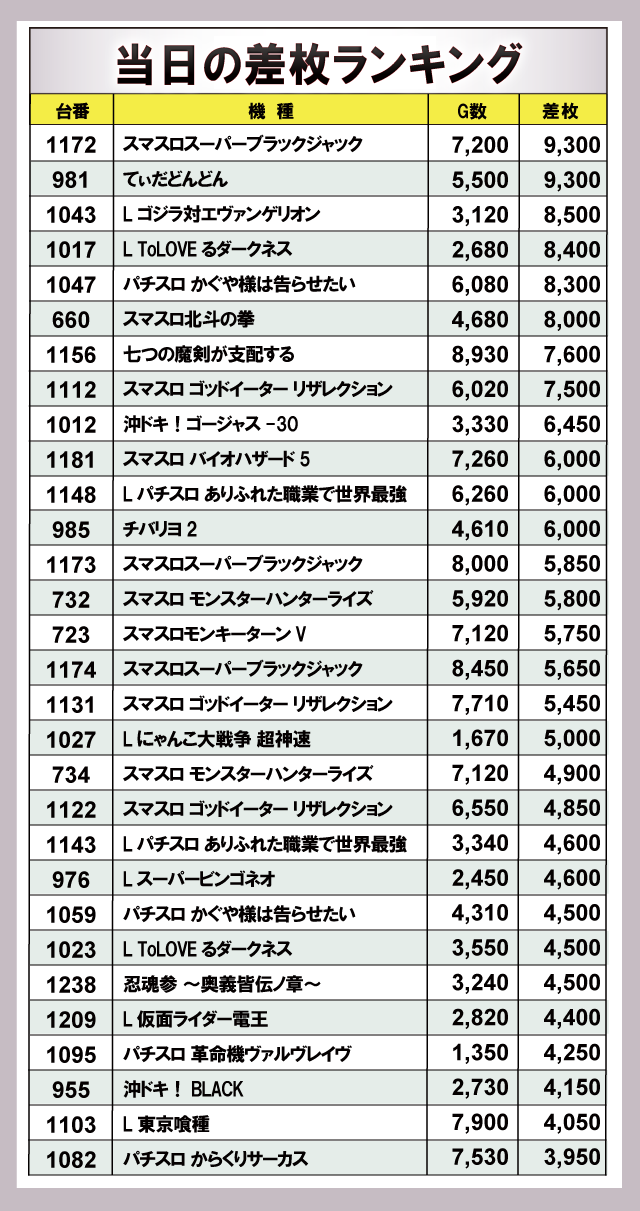 『スマスロスーパーブラックジャック』『てぃだどんどん』で+9,000枚OVER、『L ゴジラ対エヴァンゲリオン』『L ToLOVEるダークネス』『パチスロ かぐや様は告らせたい』『スマスロ北斗の拳』で+8,000枚OVERをマークするほか、多くの機種が大台突破台に続いている。万枚OVERといった派手な結果こそ残せていないが、店内各所でじっくりと遊技された形跡が確認でき、遊技していたファンは充実のひと時を過ごしていたことだろう。