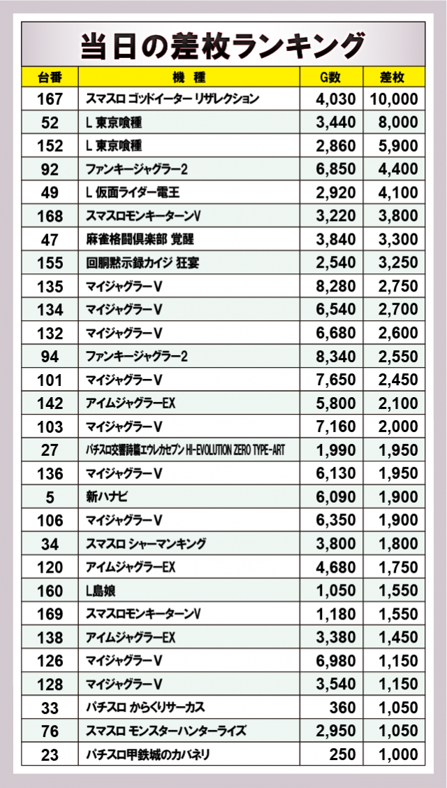 人気機種を中心に名を連ねているのが印象的だが、そのなかで『スマスロ ゴッドイーター リザレクション』が万枚OVERと活躍。これに続いて『L 東京喰種』から2台の大台突破台も発生!そのほか、『ジャグラー』シリーズが差枚数プラス4桁を多数輩出し、ファンが自信をもってレバーを叩いていた様子が目に浮かぶ。