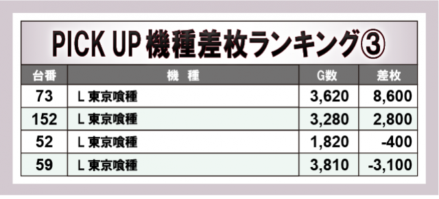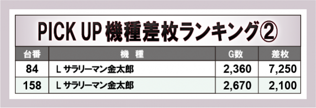 当日とくに店内を盛り上げた機種は上表の5機種。なかでも『L サラリーマン金太郎』では設置2台ともがプラス差枚数をマークし、遊技するファンにとって叩き甲斐のある状況だったに違いない。全体的にみても大きなマイナスが少なくなっており、優秀機種がいかにポテンシャルを秘めていたのかが窺えるだろう。