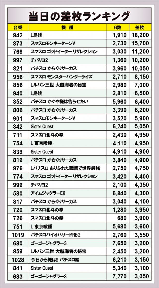 『L島娘』『スマスロモンキーターンV』『スマスロ ゴッドイーター リザレクション』『チバリヨ2』『パチスロ からくりサーカス』にて万枚OVERが生まれ、当日の店内の盛り上がりを牽引。他にも大台突破台が多く、ファンは熱気に包まれた館内に高揚感を抑えきれなかったのではないだろうか。また、新台『Sister Quest』で3台がランクインしており、今後の活躍に胸が弾む事だろう。