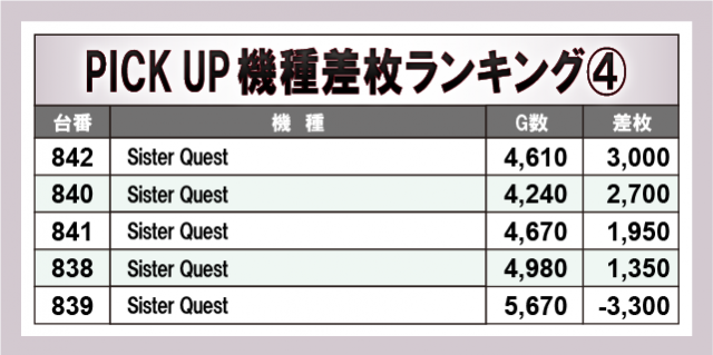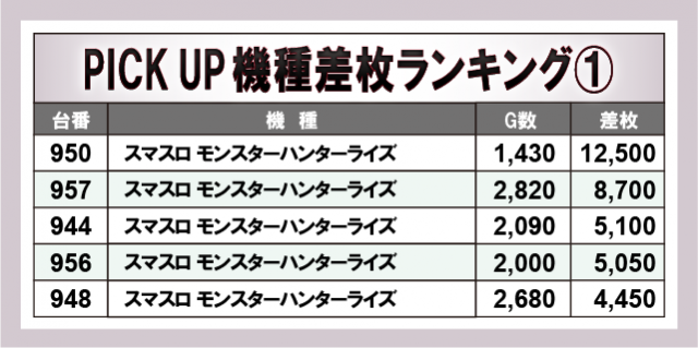 優秀機種は高い活気に満ちており、それに伴ってまとまった出玉を確保する台が目立っていた。『スマスロ モンスターハンターライズ』は万枚OVERを筆頭に4桁プラス台の多さが目に焼きつく部分で、インパクトある記録を残している。さらに『スマスロ シャーマンキング』で全台プラス差枚を記録するほか、最新台『Sister Quest』やノーマルタイプ不動の人気機種『アイムジャグラーEX』もまとまりのある出玉を多数確保し、遊技していたファンは大きな手応えを感じては、時間の許す限りレバーを叩いていたことだろう。