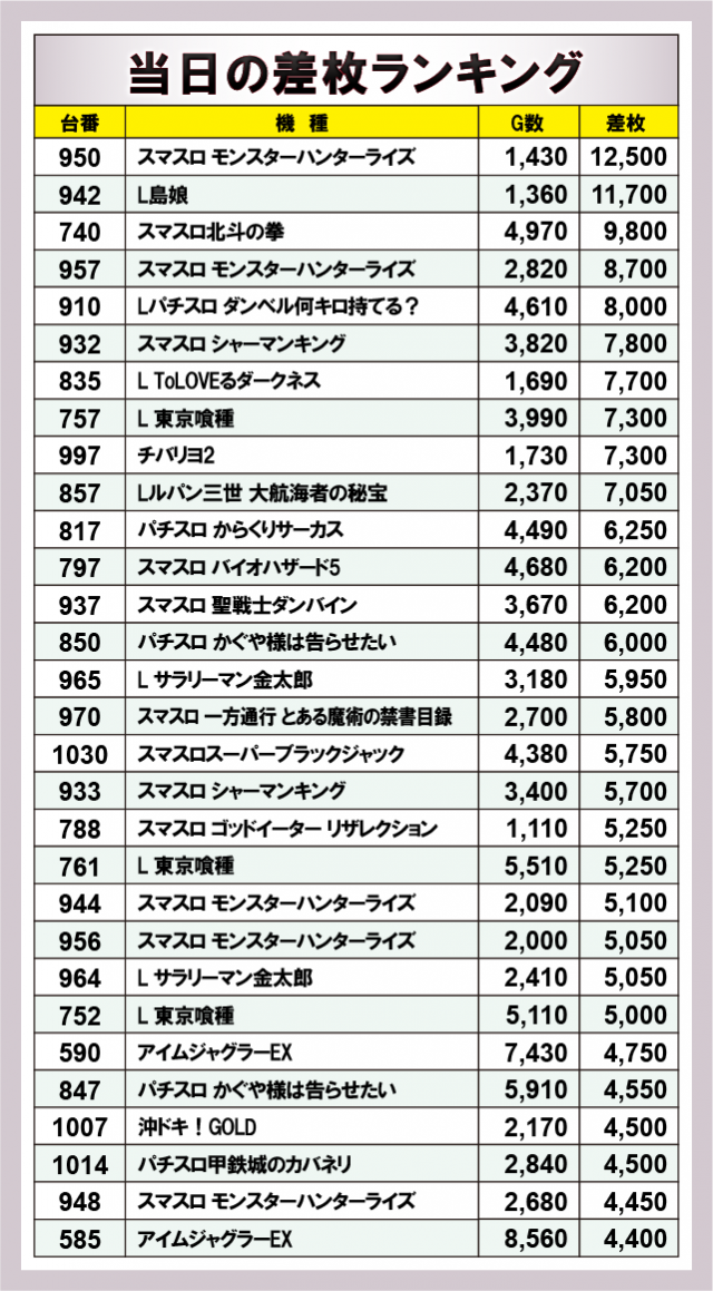 『スマスロ モンスターハンターライズ』『L島娘』にて万枚OVERが発生し、さらに『スマスロ北斗の拳』が+9,800枚をと追随。そして大台突破台の多さも目を見張るポイントで、ファンは笑顔を覗かせていた。また、スマスロ機だけでなく『沖ドキ!GOLD』や『アイムジャグラーEX』といったメダル機もランクインしており、各所で打ちごたえのある状況が整っていたことが窺える。