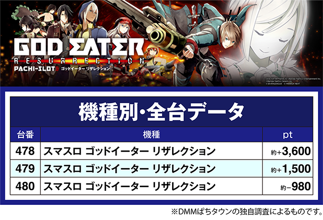 2台が約+1,500pt以上となった「スマスロ ゴッドイーター リザレクション」では、478番台が約+3,600pt。