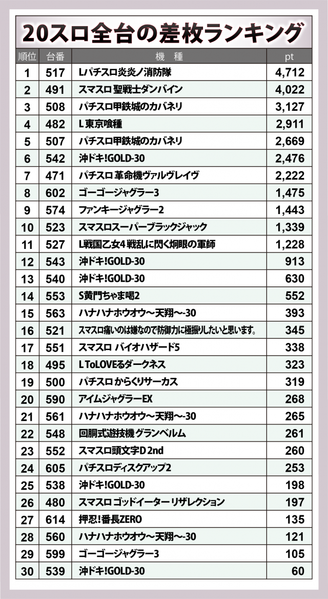 加えて『沖ドキ!GOLD-30』では+2,500枚弱の台など、ランクイン数が多かったことを追記しておきたい。