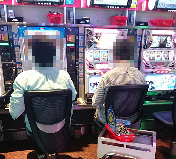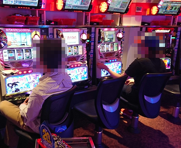 活気づいているホール内をみわたすと、「SLOT魔法少女まどか☆マギカ」に機種の魅力を堪能していると思われるプレイヤーの姿を発見。