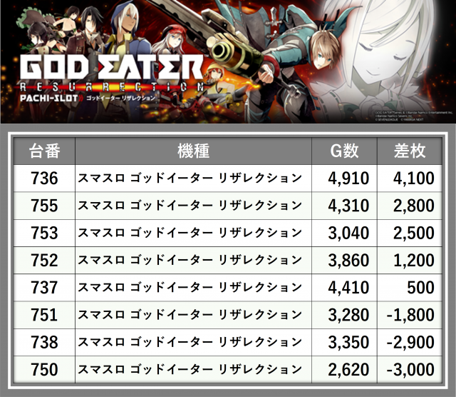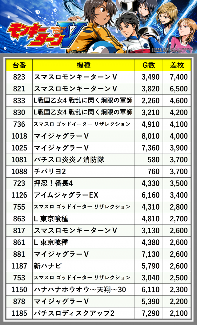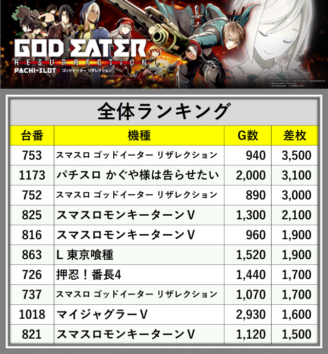 ※差枚数順に掲載しています