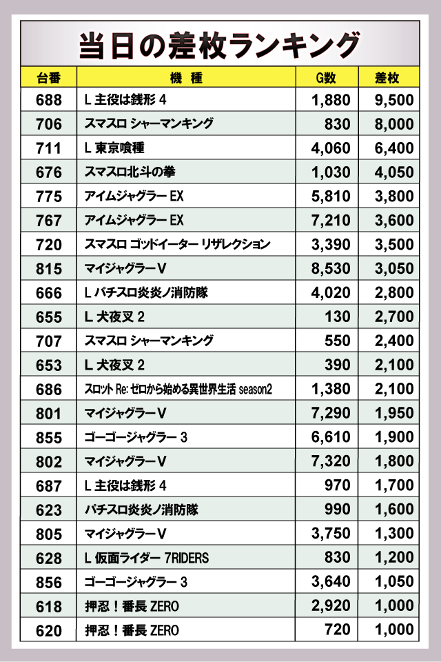惜しくも万枚には届かなかったが、『L主役は銭形4』から+9,500枚!次いで、『スマスロ シャーマンキング』から+8,000枚!また、差枚ランキングの半数近くを『ジャグラー』シリーズが占めていることが分かる。その他もメイン機種や新台だけではなく、様々な機種が名を連ねていることから店内のどこからでもチャンスがあった様子だ。