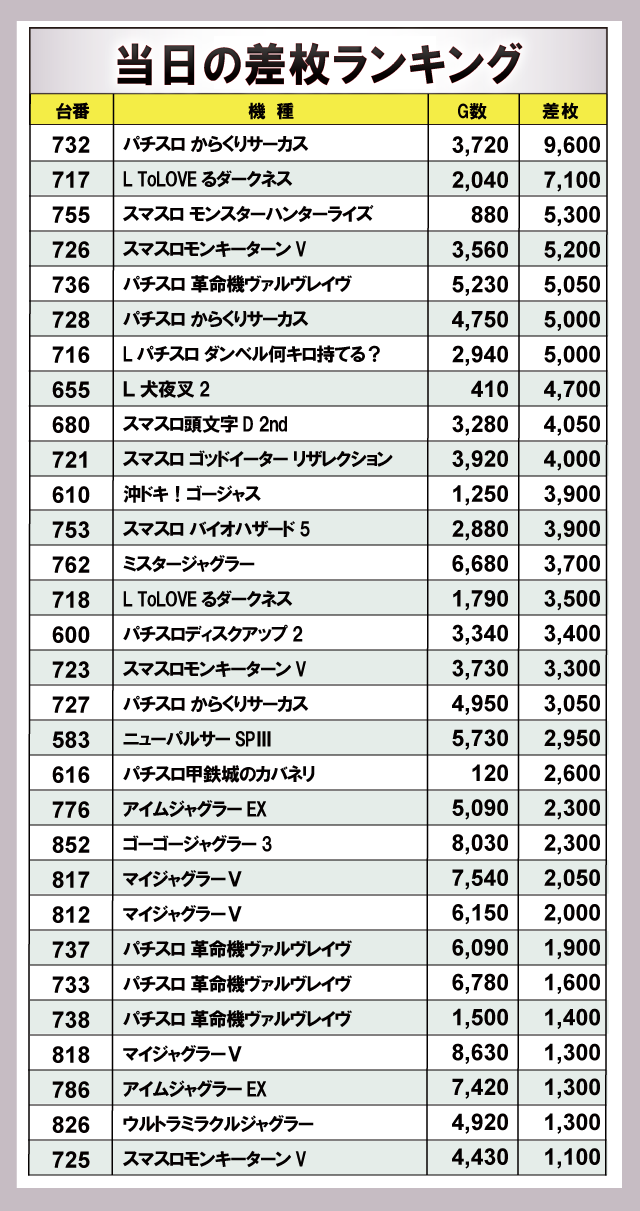 『パチスロ からくりサーカス』の+9,000枚OVERを筆頭に、『L ToLOVEるダークネス』から+7,000枚OVERが飛び出すなど、店内は大きな熱気に包まれていたようだ。 また人気スマスロ機の活躍が目立つなか、メダル機もランクインしており幅広い機種にチャンスがあったことが窺える。