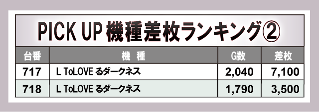 今回、活躍の中心となったのは上記の7機種だ。『L ToLOVEるダークネス』『スマスロモンキーターンV』は全台プラス差枚数を達成!また多くの機種でプラス差枚台の割合が高くなっており、優秀機種から盛り上がりが始まったと言えるだろう。