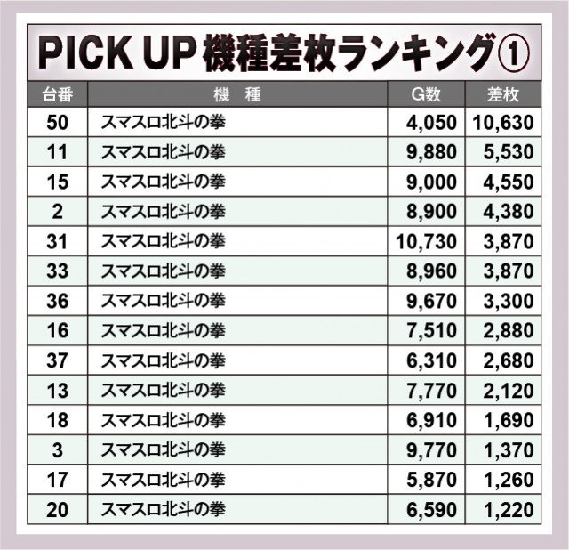 全10機種の優秀機種はいずれも終日を通して賑わっていた。『スマスロ北斗の拳』『マイジャグラーⅤ』『アイムジャグラーEX』『A-SLOT+ ディスクアップ ULTRAREMIX』『押忍!番長ZERO』は万回転OVERを確認でき、ポテンシャルを感じ取ったファンの姿が容易に想像できる。いずれもまとまった出玉を確保しており、万枚OVERも発生していたことから、優秀機種が盛り上がりの中心になっていたと言っても過言ではない。