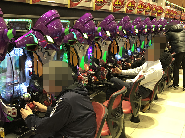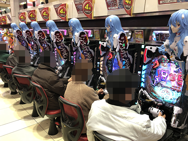 14時ごろの4円パチンコの様子を見ると「ぱちんこ シン・エヴァンゲリオン Type レイ」や「新世紀エヴァンゲリオン〜未来への咆哮〜」が大盛り上がり。機種性能を存分に発揮するプレイヤーを目の当たりにしている。