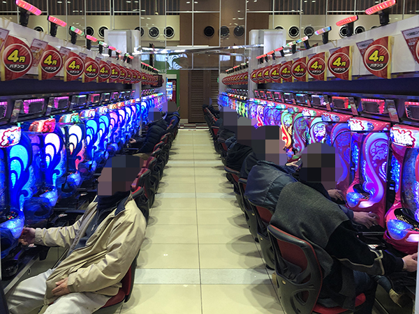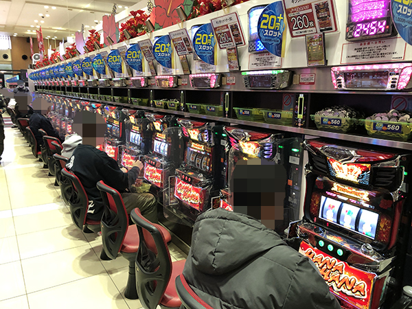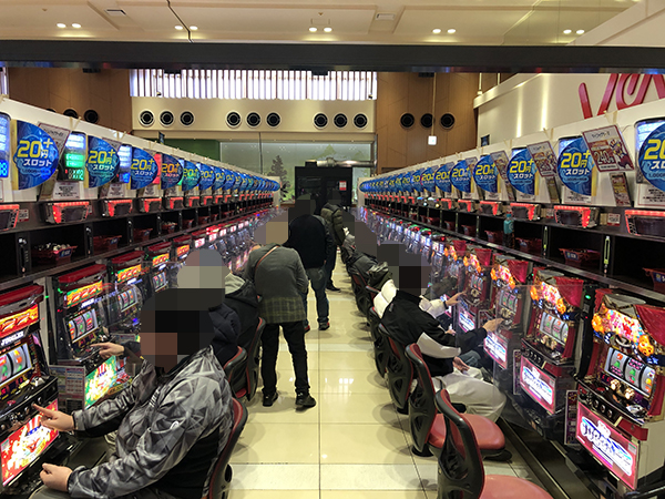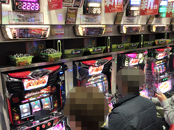 機種構成が魅力的な500円/89枚パチスロを見ると、ほぼ満席となるほどの盛況ぶりだった。