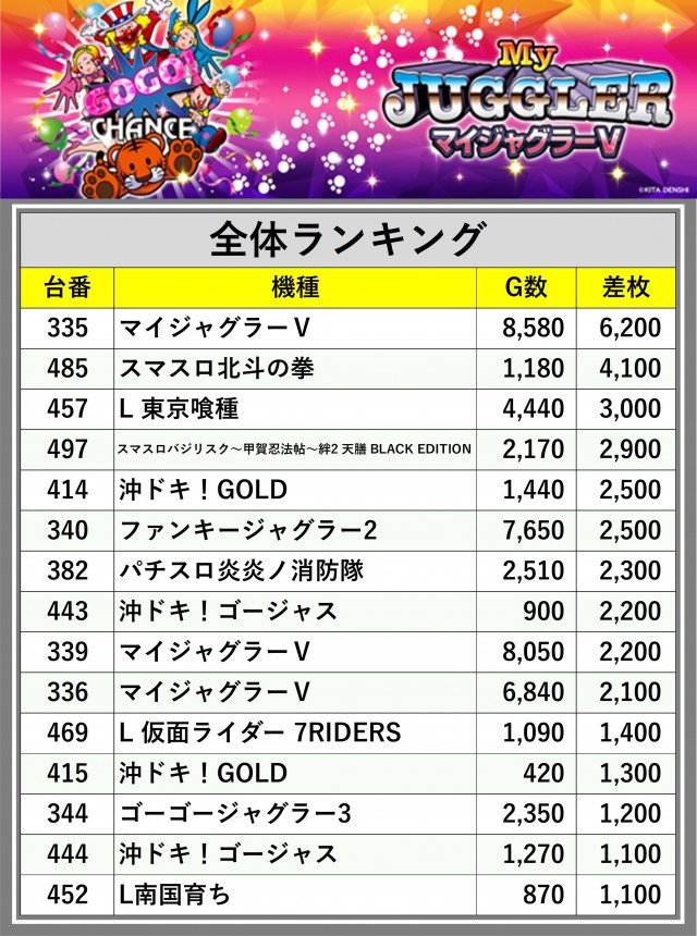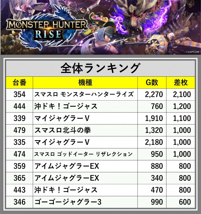 厳選された取材対象機種をはじめ、その他スロット全体から好記録が飛び出した!プレイヤーが楽しんだ1日を下記データにて振り返ってみて欲しい。