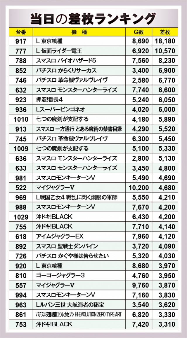 『L 東京喰種』『L 仮面ライダー電王』にて万枚OVERが飛び出し、特に前者は18,000枚OVERと凄まじい熱気を放っていたのが鮮烈であるばかり。他にも大台突破台が多く生まれており、まとまった出玉を確保する台が多かったことから、店内は大きく盛り上がっていたのが如実に窺える。また『マイジャグラーⅤ』の万回転OVERなど終日を通して打ち込まれた形跡も見られ、活気と熱気に満ちた1日になったようだ。
