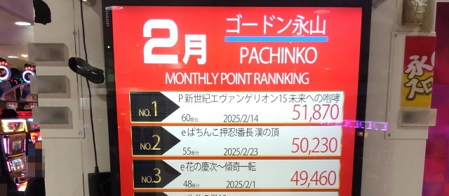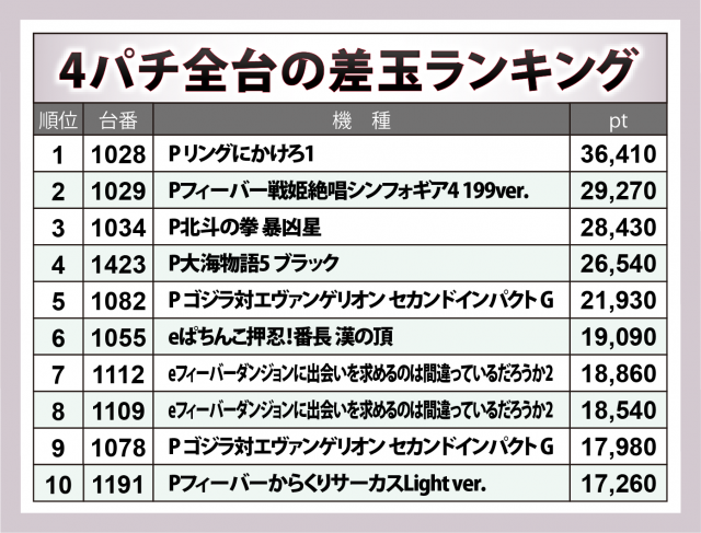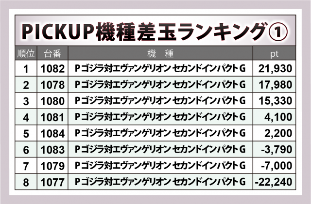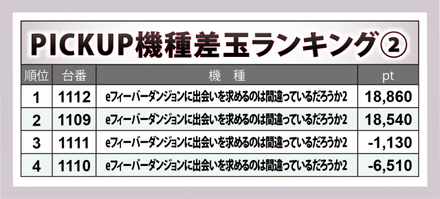 『Pリンかけ1』と同じくデビュー日となった『eフィーバーダンジョンに出会いを求めるのは間違っているだろうか2』や定番人気の『P ゴジラ対エヴァンゲリオン セカンドインパクト G 』に5桁プラスの台が見受けられた。