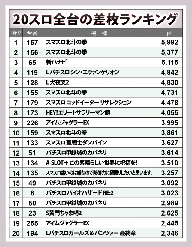 まずはいずれも+2,300枚以上を記録した[1000円/46枚]スロのベスト20台をチェック。