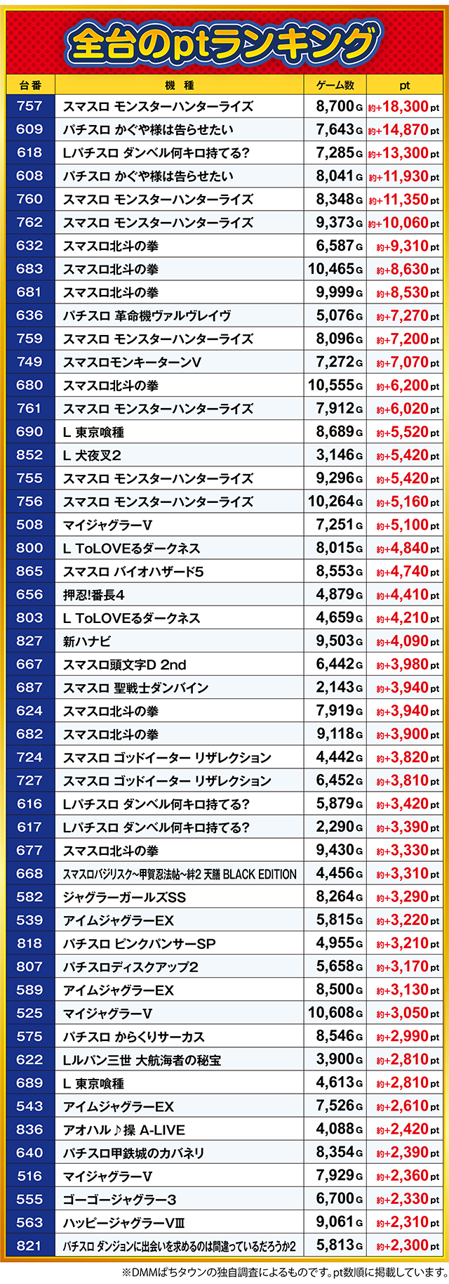 約+3,000ptを超えた525番台を含めて、5割以上となる18台がプラスとなった。