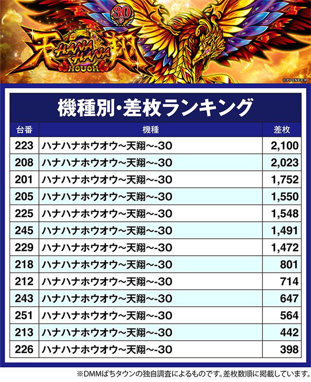 「ハナハナホウオウ~天翔~-30」は、13台がプラスとなり、半数以上が1,000pt超!