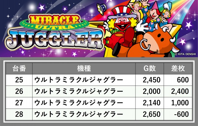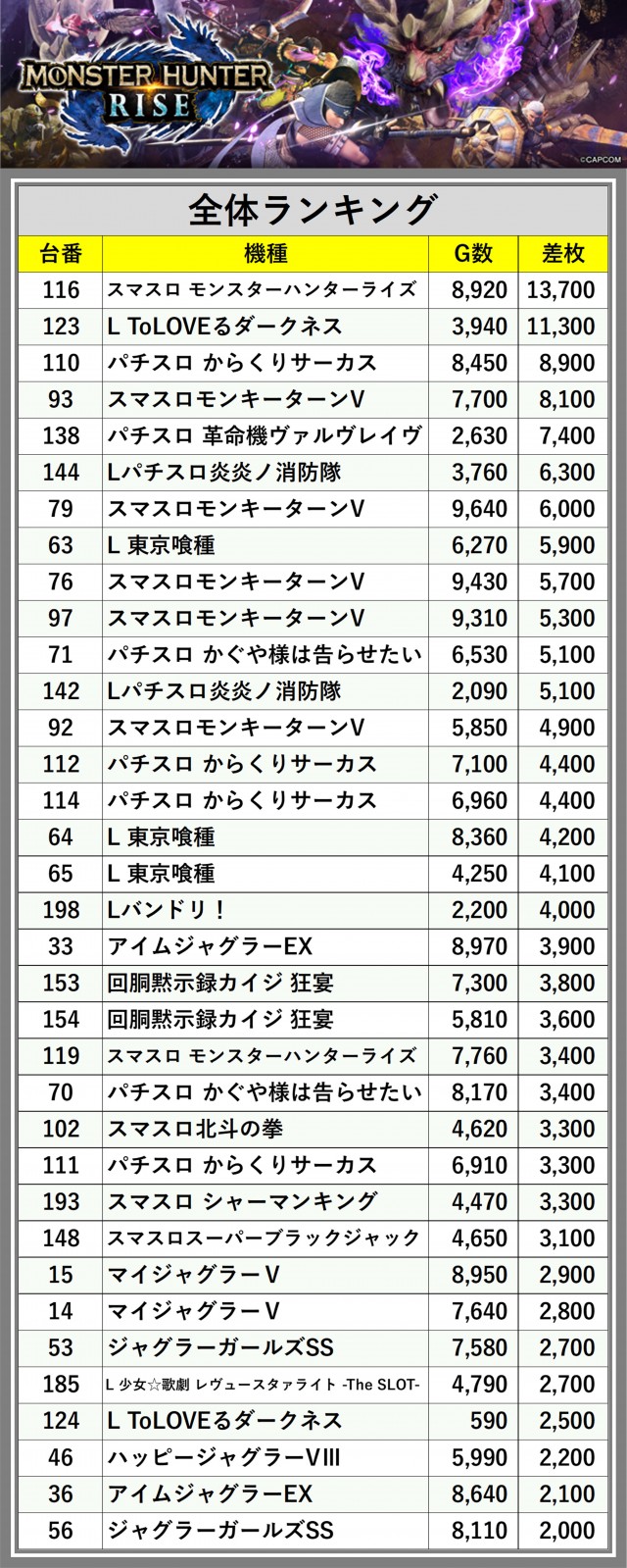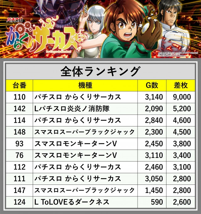 厳選された取材対象機種をはじめ、その他スロット全体から好記録が飛び出した!プレイヤーが楽しんだ1日を下記データにて振り返ってみて欲しい。
