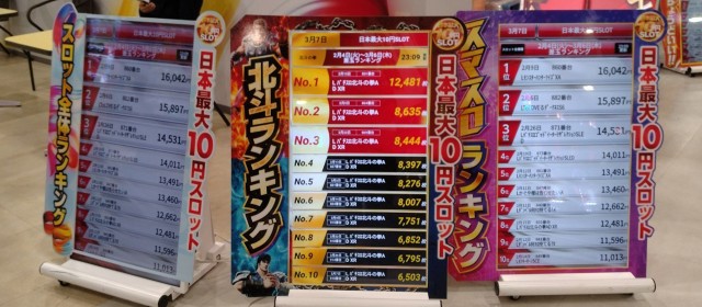 頭上に華々しい出玉札が躍っていたのが『スマスロ モンスターハンターライズ』『パチスロ からくりサーカス』の2機種。20スロのホールにも負けない好成績が飛び出していた。