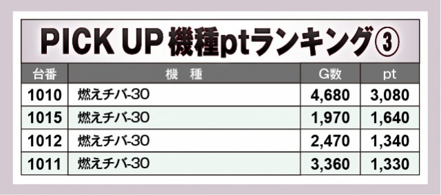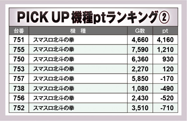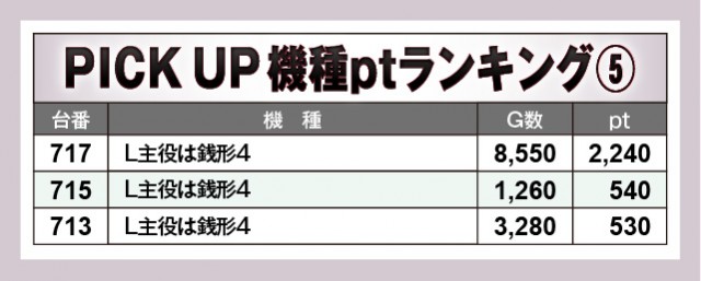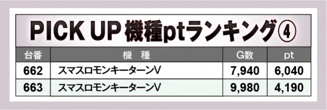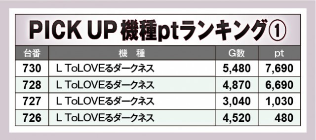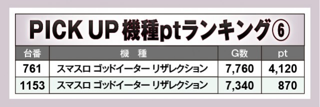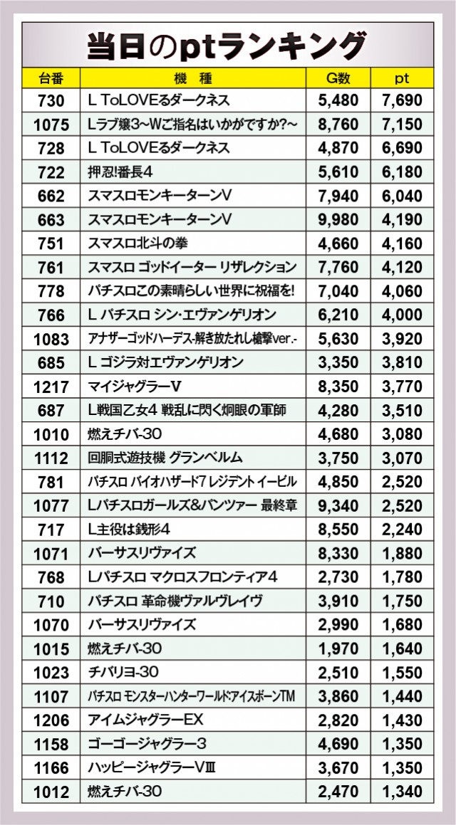 上表をご覧の通り、店内に設置されたあらゆる機種が活躍した1日となったようだ。その中で『L ToLOVEるダークネス』『Lラブ嬢3〜Wご指名はいかがですか?〜』が7,000pt OVERと気を吐き、さらに6,000pt OVERを達成した機種もズラリと並んでいる。全体的にまとまった出玉を確保しており、遊技していたファンは右肩上がりに伸びる出玉を前にしては、恍惚の表情を浮かべていたに違いない。